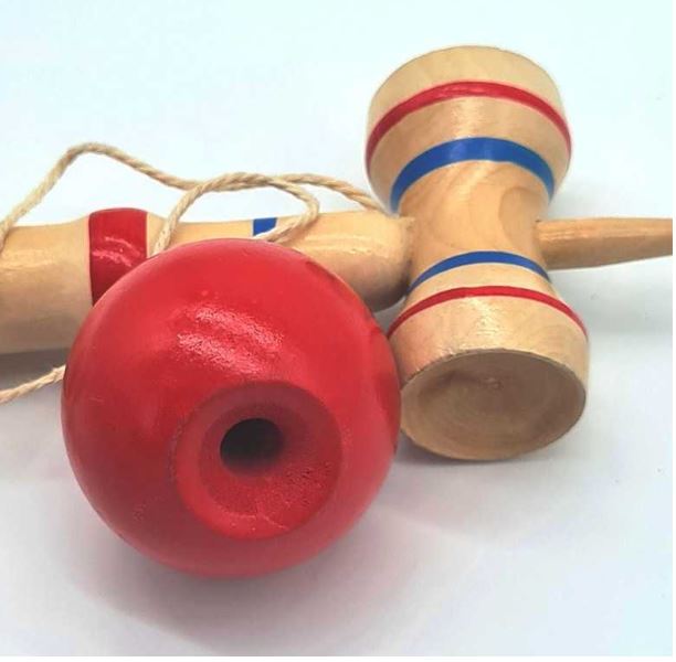 Kendama Profesionala Clasica din Lemn natur cu Bila Rosie[/caption]